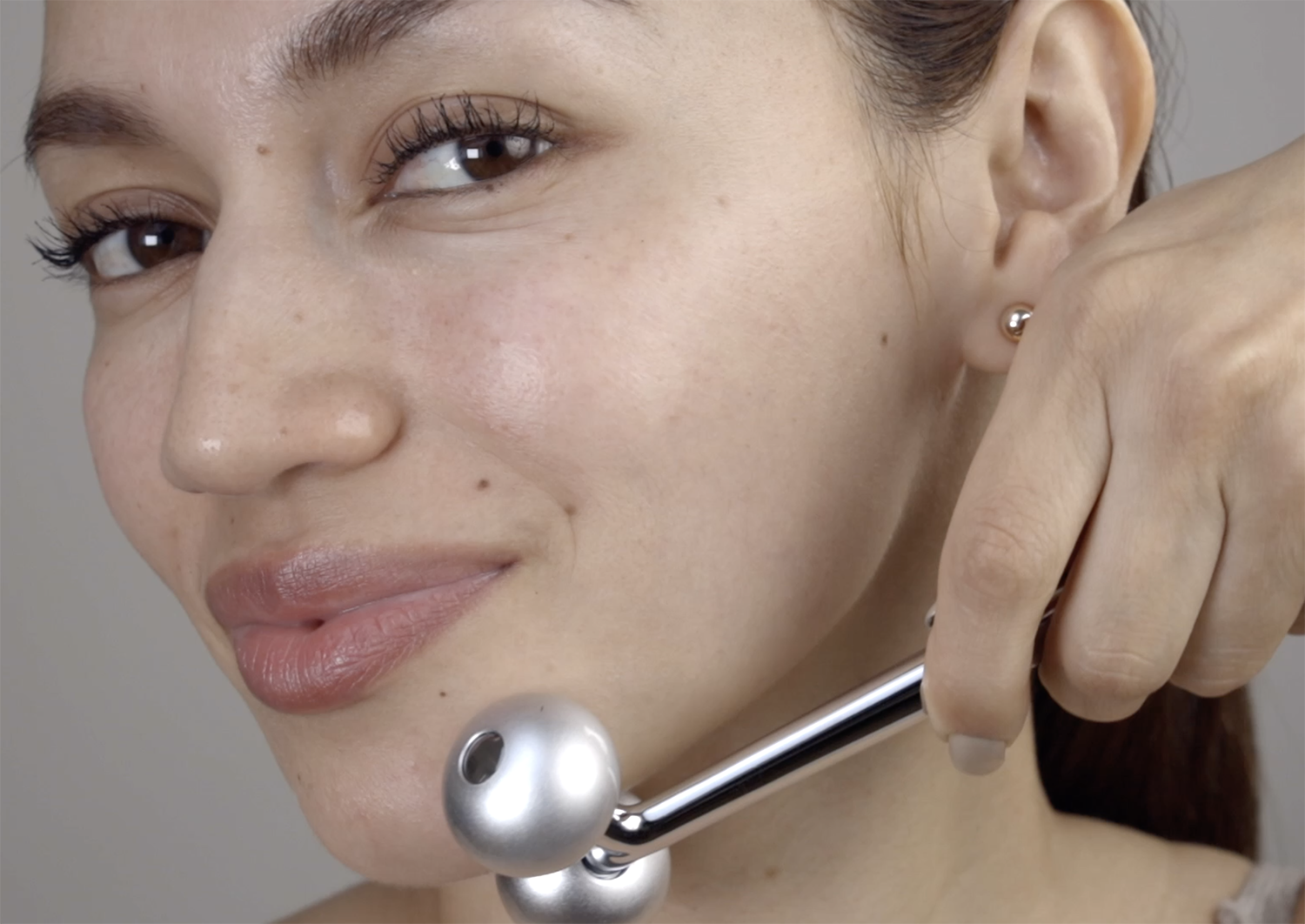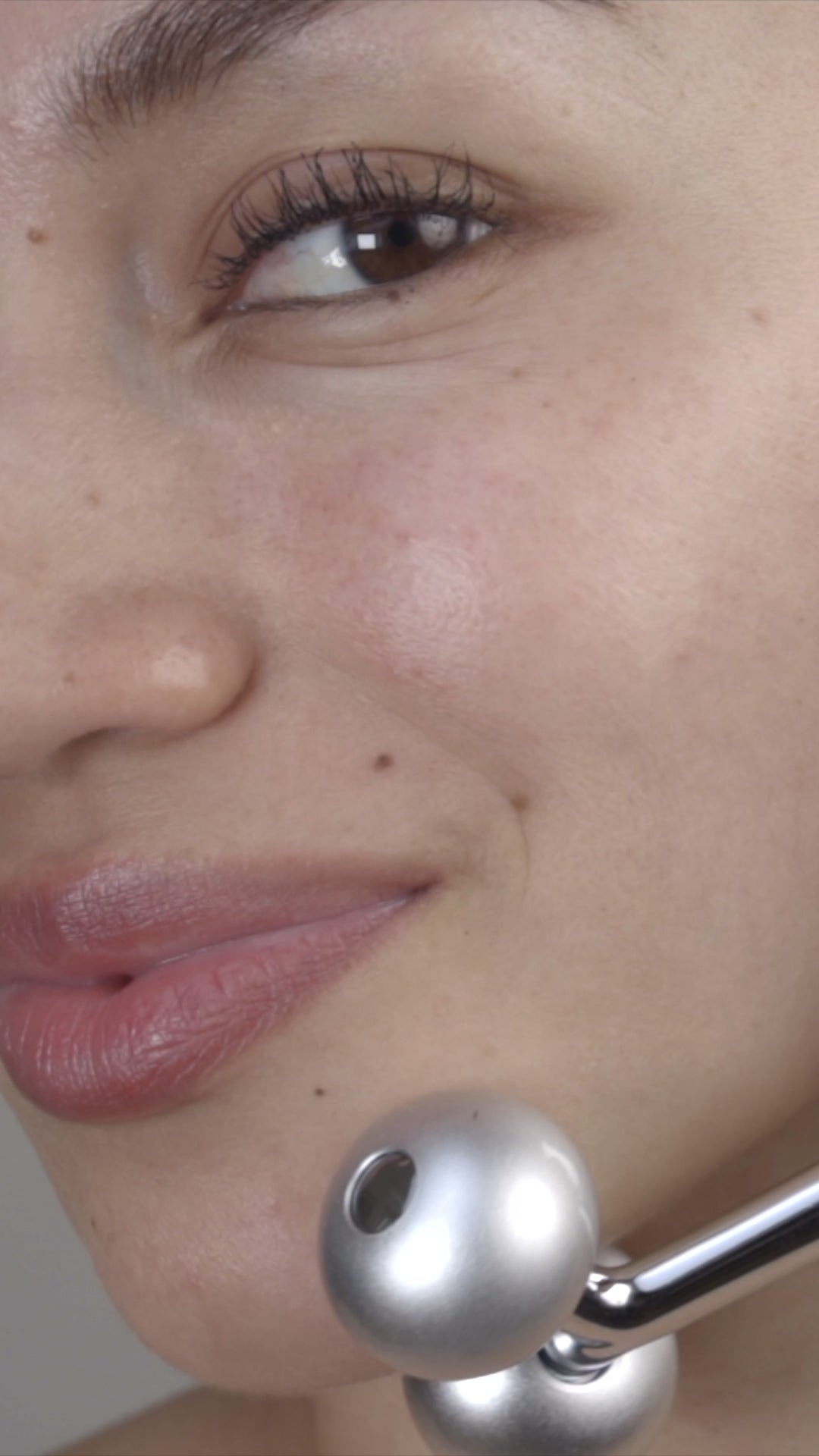 Start at the inner corner of the eyebrow. With the brow bone between the rollers, glide The Sculptor along the eyebrow.