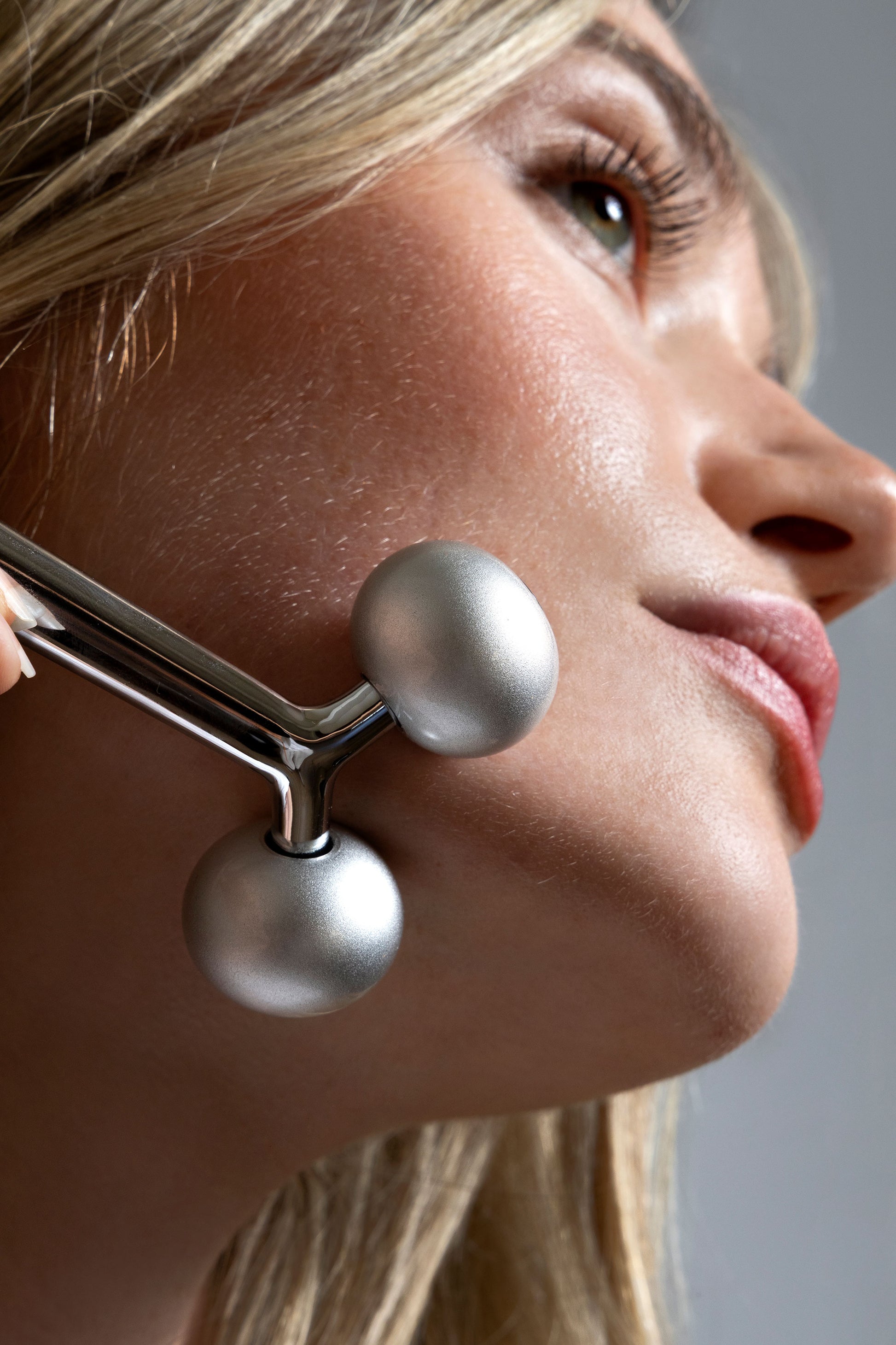 Start at the side of the nose. Place the cheekbone between the rollers and glide The Sculptor toward the earlobe.